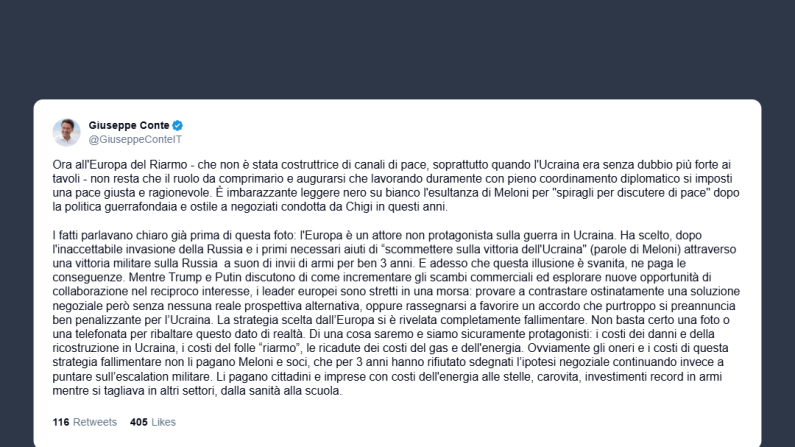 Il presidente del Movimento 5 Stelle, Giuseppe Conte, ha pubblicato un commento su X in cui ha sottolineato che «all’Europa del Riarmo – che non è stata costruttrice di canali di pace, soprattutto quando l’Ucraina era senza dubbio più forte ai tavoli – non resta che il ruolo da comprimario». Conte ha definito «imbarazzante» l’esultanza della presidente del Consiglio Giorgia Meloni per «spiragli per discutere di pace».