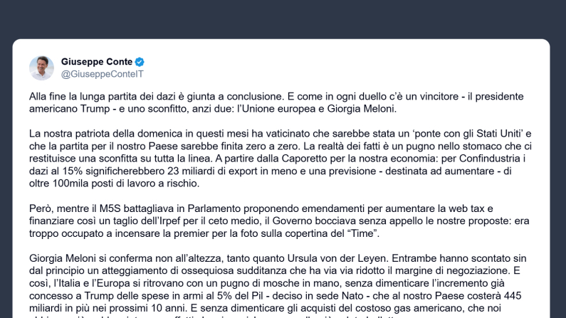 Giuseppe Conte, leader del Movimento 5 Stelle, ha pubblicato un post su X commentando l’esito dell’accordo sui dazi tra Ue e Stati Uniti, definendo il presidente Usa Donald Trump il «vincitore» e l’Unione Europea, insieme a Giorgia Meloni, gli «sconfitti».
