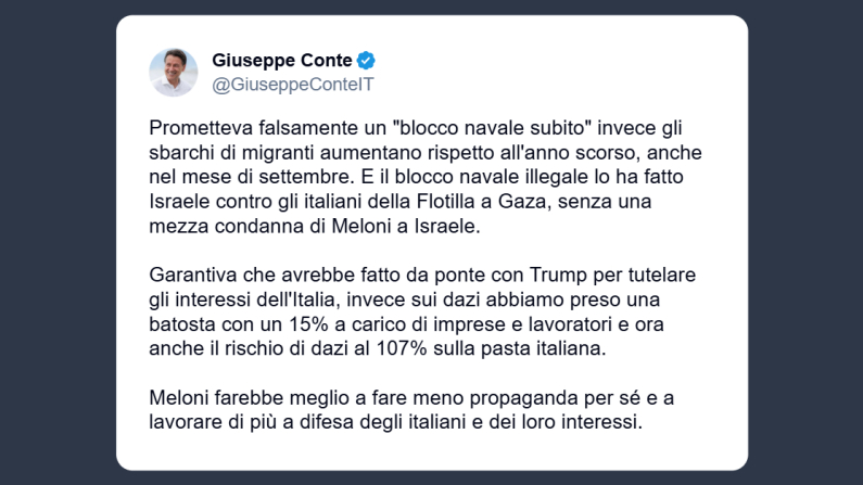 «Prometteva falsamente un blocco navale immediato e invece gli sbarchi di migranti aumentano rispetto all’anno scorso. E il blocco navale illegale lo ha fatto Israele contro gli italiani della Flotilla a Gaza, senza una mezza condanna di Meloni a Israele». Lo ha dichiarato su X il presidente del Movimento 5 Stelle, Giuseppe Conte. Per Conte, la Meloni «garantiva che avrebbe fatto da ponte con Trump per tutelare gli interessi dell’Italia, invece sui dazi abbiamo preso una batosta con un 15% a carico di imprese e lavoratori e ora anche il rischio di dazi al 107% sulla pasta italiana». Il capo del Governo – conclude Conte – «farebbe meglio a fare meno propaganda per sé e a lavorare di più a difesa degli italiani e dei loro interessi».