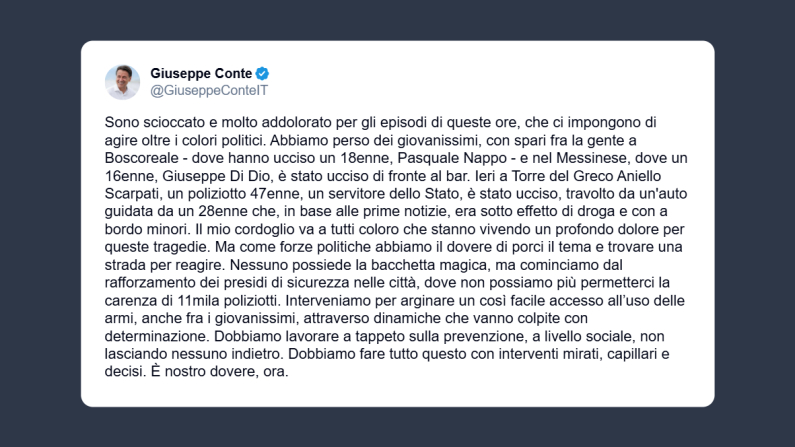 Il capo del Movimento 5 Stelle, Giuseppe Conte, ha scritto ieri su X: «Sono scioccato e molto addolorato per gli episodi di queste ore, che ci impongono di agire oltre i colori politici. Abbiamo perso dei giovanissimi, con spari fra la gente a Boscoreale – dove hanno ucciso un 18enne, Pasquale Nappo – e nel Messinese, dove un 16enne, Giuseppe Di Dio, è stato ucciso di fronte al bar. Ieri a Torre del Greco Aniello Scarpati, un poliziotto 47enne, un servitore dello Stato, è stato ucciso, travolto da un’auto guidata da un 28enne che, in base alle prime notizie, era sotto effetto di droga e con a bordo minori. Il mio cordoglio va a tutti coloro che stanno vivendo un profondo dolore per queste tragedie. Ma come forze politiche abbiamo il dovere di porci il tema e trovare una strada per reagire».