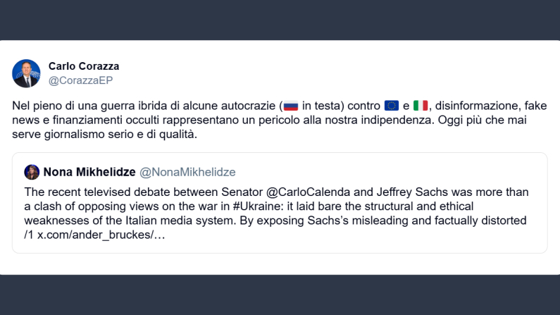 Il portavoce del Parlamento europeo in Italia, Carlo Corazza, ha scritto ieri su X: «nel pieno di una guerra ibrida di alcune autocrazie (Russia in testa) contro Europa e Italia, disinformazione, fake news e finanziamenti occulti rappresentano un pericolo alla nostra indipendenza. Oggi più che mai serve giornalismo serio e di qualità».