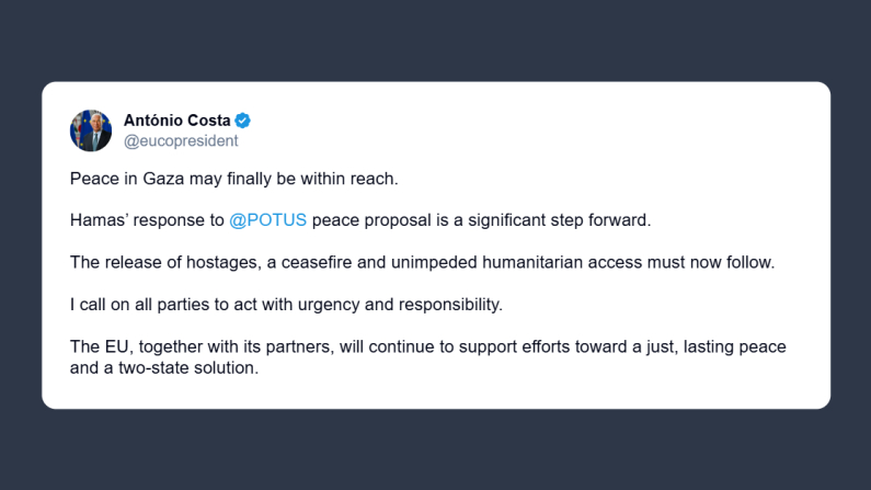 Il presidente del Consiglio europeo, Antonio Costa, ha così commentato su X gli sviluppi a Gaza: «La pace a Gaza potrebbe finalmente essere a portata di mano. La risposta di Hamas alla proposta di pace del presidente degli Stati Uniti rappresenta un significativo passo in avanti».