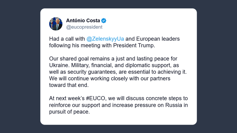 Il presidente del Consiglio europeo, Antonio Costa, ha scritto su X: «ho avuto un colloquio telefonico con Volodymyr Zelensky e i presidenti europei dopo il suo incontro con il presidente Donald Trump».