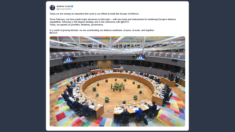 Il presidente del Consiglio europeo, Antonio Costa, ha scritto su X: «Oggi chiudiamo un importante primo ciclo nei nostri sforzi per costruire l’Europa della difesa. Da febbraio, abbiamo compiuto progressi significativi su questo tema, con nuovi strumenti per rafforzare le capacità difensive dell’Europa, seguendo una strategia a 360 gradi e in piena coerenza con la Nato». Oggi, conclude Costa, «abbiamo concordato priorità, tempistiche e governance. In un mondo di minacce crescenti, stiamo accelerando la nostra prontezza difensiva: con rapidità, su larga scala e uniti».