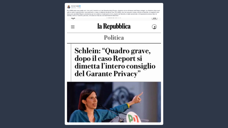 Il deputato di Forza Italia, Enrico Costa, ha commentato su X un articolo de la Repubblica con la seguente dichiarazione: «Pd e M5S dopo aver eletto con i loro voti 2 membri su 4 del Garante della privacy, chiedono ora le dimissioni dell’intero collegio. Le chiedono dopo aver letto le carte o approfondito i provvedimenti, o dopo un’attenta istruttoria? No, Pd e M5S, che mai avevano mosso critiche al Garante, si svegliano solo dopo aver ascoltato Report, prendendo per oro colato le ricostruzioni di chi, proprio dal Garante, è stato sanzionato. Un’opposizione senza idee né identità, come un vecchio juke box, si fa dare la linea da una trasmissione televisiva».