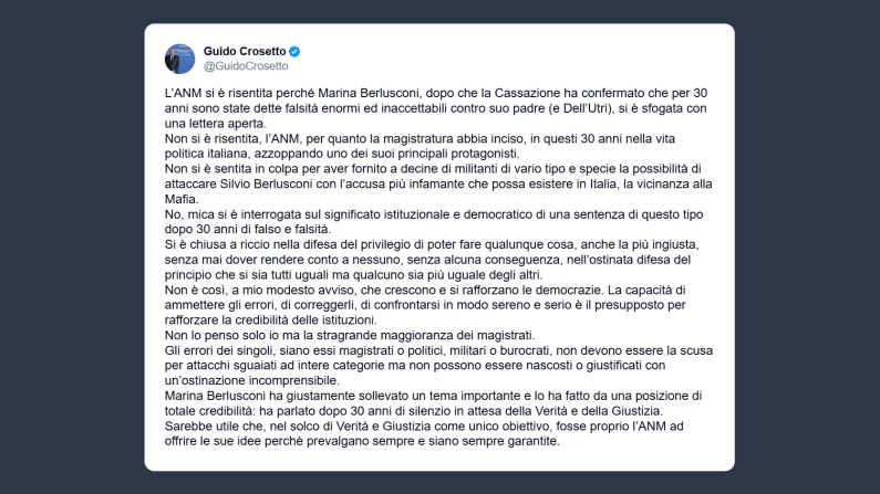 Il ministro della Difesa, Guido Crosetto, ha scritto su X: «L’Anm si è risentita perché Marina Berlusconi, dopo che la Cassazione ha confermato che per 30 anni sono state dette falsità enormi ed inaccettabili contro suo padre (e Dell’Utri), si è sfogata con una lettera aperta. Non si è risentita, l’Anm, per quanto la magistratura abbia inciso, in questi 30 anni nella vita politica italiana, azzoppando uno dei suoi principali protagonisti».