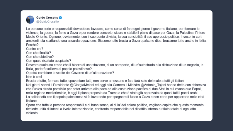 Il ministro della Difesa Guido Crosetto, scrivendo su X è tornato sul tema di Gaza dicendo: «Le persone serie e responsabili dovrebbero lavorare, come cerca di fare ogni giorno il governo italiano, per fermare le violenze, la guerra, la fame a Gaza e per rendere concreto, sicuro e stabile il piano di pace per Gaza, la Palestina, l’intero Medio Oriente. Ognuno, ovviamente, con il suo punto di vista, la sua sensibilità, il suo approccio politico. Invece, in certi ambienti, sta scattando una assurda equazione. Siccome tutto brucia a Gaza qualcuno dice: bruciamo tutto anche in Italia».