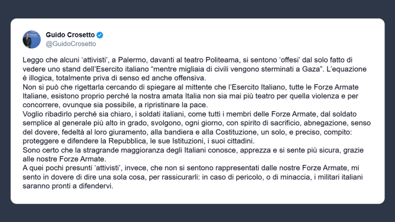 Crosetto ha poi ribadito che «i soldati italiani, come tutti i membri delle Forze Armate, dal soldato semplice al generale più alto in grado, svolgono, ogni giorno, con spirito di sacrificio, abnegazione, senso del dovere, fedeltà al loro giuramento, alla bandiera e alla Costituzione, un solo, e preciso, compito: proteggere e difendere la Repubblica, le sue Istituzioni, i suoi cittadini». In conclusione, dice Crosetto, «a quei pochi presunti ‘attivisti’, invece, che non si sentono rappresentati dalle nostre Forze Armate, mi sento in dovere di dire una sola cosa, per rassicurarli: in caso di pericolo, o di minaccia, i militari italiani saranno pronti a difendervi».