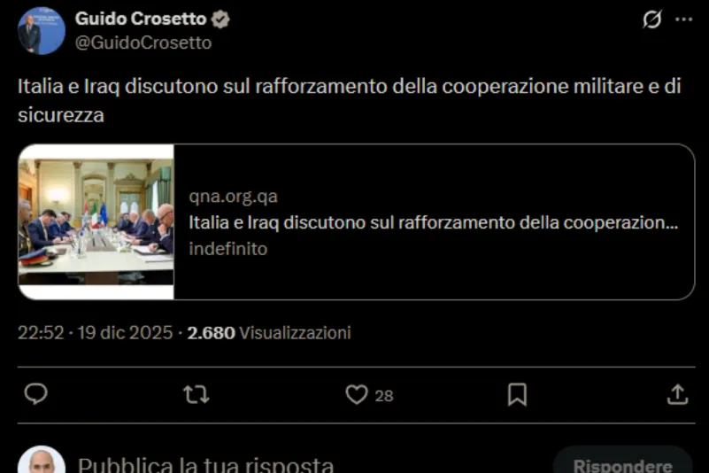 Il ministro della Difesa Guido Crosetto ha postato su X un articolo dell’Agenzia di stampa del Qatar con la seguente notizia: «Italia e Iraq discutono sul rafforzamento della cooperazione militare e di sicurezza. Il ministro della Difesa italiano Guido Crosetto ha incontrato venerdì il ministro degli Esteri iracheno Fuad Hussein, attualmente in visita a Roma, per discutere del rafforzamento della cooperazione militare e di sicurezza tra i due Paesi. Nel corso dell’incontro, entrambe le parti hanno sottolineato le solide relazioni tra i rispettivi Paesi, in particolare nei settori della cooperazione militare e di sicurezza e della lotta al terrorismo, a dimostrazione del livello di partenariato esistente. Hanno inoltre discusso le modalità per sviluppare la cooperazione nei settori militare e della difesa, concordando di lavorare insieme per rimuovere gli ostacoli che impediscono tale cooperazione, contribuendo così a rafforzare il partenariato bilaterale. In questo contesto, il ministro della Difesa italiano ha sottolineato la partecipazione del suo Paese all’addestramento di circa 60.000 soldati e ufficiali di polizia iracheni di varie formazioni attraverso programmi e corsi di formazione specializzati. I due ministri hanno inoltre discusso degli ultimi sviluppi regionali, in particolare della crisi siriana, e hanno sottolineato l’importanza di sostenere la stabilità in Siria e la necessità di allentare le tensioni nella regione».