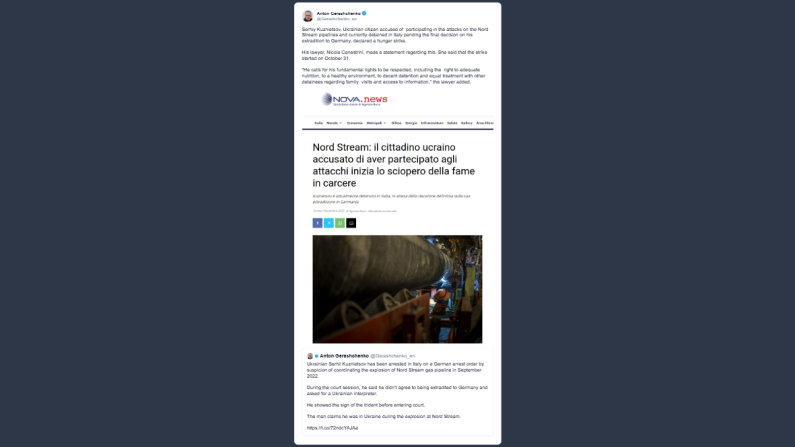 Anton Gerashchenko, ex vice ministro degli Interni ucraino e consigliere ufficiale, ha scritto su X: «Serhiy Kuznietsov, cittadino ucraino accusato di aver partecipato agli attentati ai gasdotti nord Stream e attualmente detenuto in Italia in attesa della decisione definitiva sull’estradizione in Germania, ha proclamato lo sciopero della fame. Il suo avvocato, Nicola Canestrini, ha rilasciato una dichiarazione in merito. Ha precisato che lo sciopero è iniziato il 31 ottobre. Chiede che siano rispettati i suoi diritti fondamentali, tra cui quello a un’alimentazione adeguata, a un ambiente sano, a una detenzione dignitosa e a un trattamento paritario con gli altri detenuti per quanto riguarda le visite familiari e l’accesso alle informazioni».