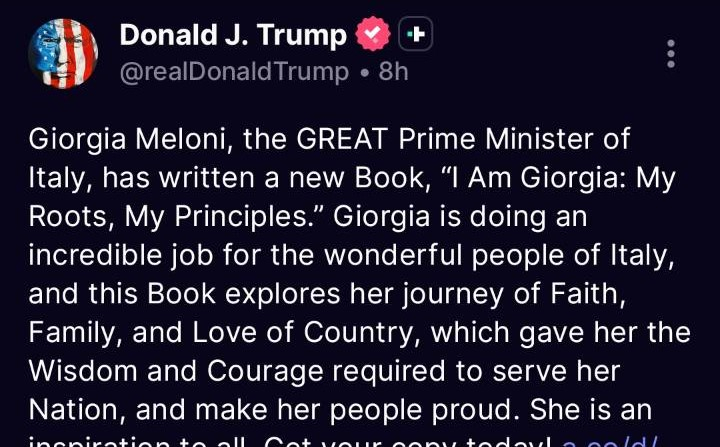 «Giorgia Meloni, eccellente presidente del Consiglio italiano, ha scritto un nuovo libro, Io sono Giorgia: le mie radici, i miei principi. Giorgia sta svolgendo un lavoro straordinario per il meraviglioso popolo italiano, e questo libro esplora il suo percorso di fede, famiglia e amore per la patria, che le hanno fornito la saggezza e il coraggio necessari per servire la nazione e rendere orgogliosi i suoi cittadini. È un’ispirazione per tutti».