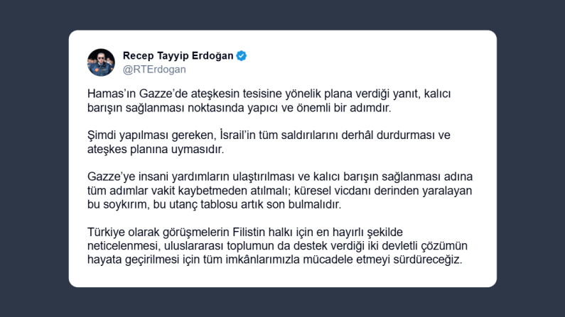 Il presidente turco, Recep Tayyip Erdogan, ha dichiarato su X che la risposta di Hamas al piano per arrivare a un cessate il fuoco a Gaza rappresenta un «passo significativo verso una pace duratura». Ora è necessario, afferma Erdogan, che Israele ponga «immediatamente fine a tutti gli attacchi e aderisca al piano di cessate il fuoco. Occorre agire senza indugio per garantire l’arrivo degli aiuti umanitari a Gaza e per consolidare una pace stabile». Questo «genocidio – conclude il presidente – che ferisce profondamente la coscienza mondiale, deve finire. La Turchia continuerà a impegnarsi con ogni mezzo affinché i negoziati portino ai migliori risultati per il popolo palestinese e affinché si realizzi la soluzione a due Stati».