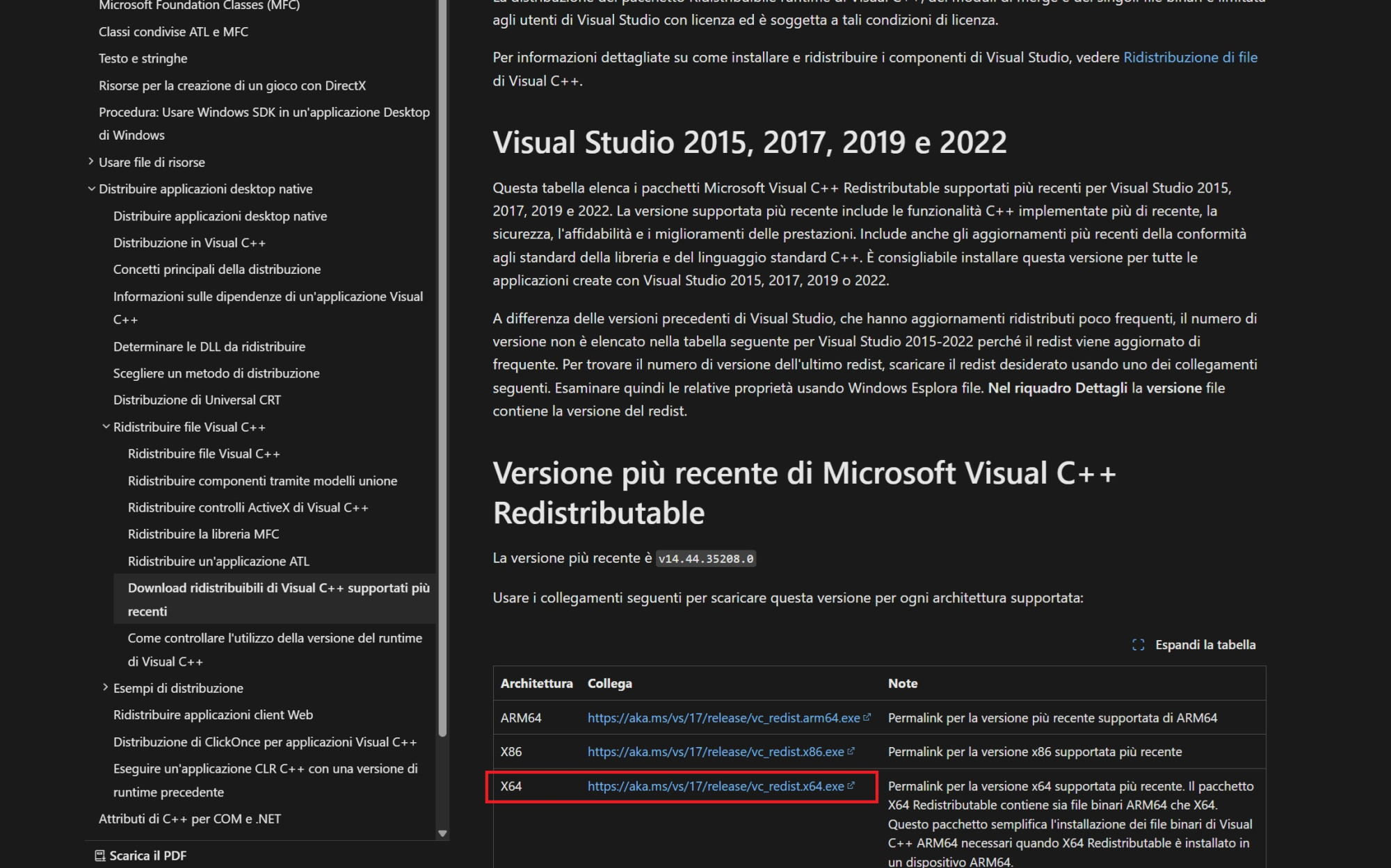 Prendiamo pure il caso della dll “MSVCP140” come esempio. Un’ottima soluzione potrebbe essere quella di installare Visual C++ Runtime direttamente dal sito ufficiale Microsoft. Per scaricarlo, basta cliccare sul link nella voce X64 (se avete windows a 32 bit scaricate invece la versione X86).