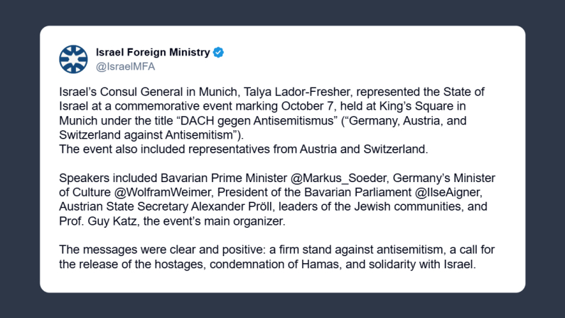 Il ministero degli esteri Israeliano ha scritto su X: il console generale di Israele a Monaco, Talya Lador-Fresher, «ha rappresentato lo Stato di Israele a un evento commemorativo del 7 ottobre, tenutosi in Piazza del Re a Monaco con il titolo «DACH contro l’antisemitismo (Germania, Austria e Svizzera contro l’antisemitismo)». All’evento hanno partecipato anche rappresentanti di Austria e Svizzera. Tra i relatori, il primo ministro della Baviera Markus Soeder, il ministro della Cultura tedesco Wolfram Weimer, il Presidente del Parlamento bavarese Ilse Aigner, il sottosegretario di Stato austriaco Alexander Pröll, rappresentante delle comunità ebraiche e il professor Guy Katz, principale organizzatore dell’evento. Il ministero ha dichiarato che i messaggi sono stati chiari e positivi: «una ferma condanna dell’antisemitismo, un appello per la liberazione degli ostaggi, la denuncia di Hamas e la solidarietà con Israele».