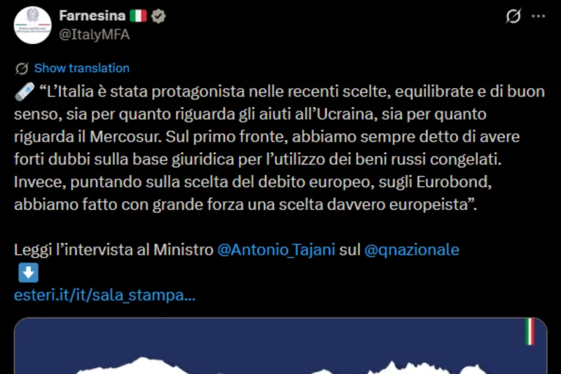 La Farnesina ha scritto su X la seguente dichiarazione di Antonio Tajani: «l’Italia è stata protagonista nelle recenti scelte, equilibrate e di buon senso, sia per quanto riguarda gli aiuti all’Ucraina, sia per quanto riguarda il Mercosur. Sul primo fronte, abbiamo sempre detto di avere forti dubbi sulla base giuridica per l’utilizzo dei beni russi congelati. Invece, puntando sulla scelta del debito europeo, sugli Eurobond, abbiamo fatto con grande forza una scelta davvero europeista».