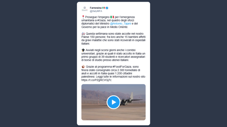 Il ministero degli Affari Esteri e della Cooperazione Internazionale, Farnesina, ha postato su X: «Prosegue l’impegno dell’Italia per l’emergenza umanitaria a Gaza, nel quadro degli sforzi diplomatici del Ministro Antonio Tajani e del Governo per la pace in Medio Oriente. Questa settimana sono state accolte nel nostro Paese 150 persone; fra loro anche 15 bambini affetti da gravi malattie che sono stati ricoverati in ospedali italiani».