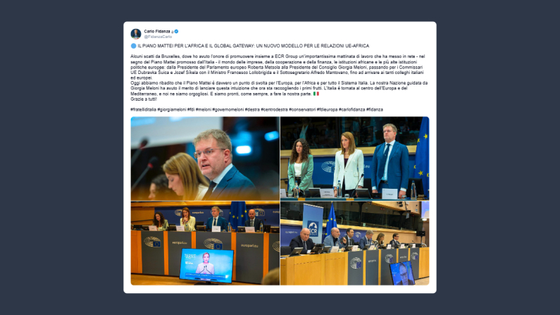 Il capodelegazione di Fratelli d’Italia, Ecr al Parlamento europeo, Carlo Fidanza, ha scritto ieri su X: «il piano Mattei per l’Africa e il Global Gateway, un nuovo modello per le relazioni Ue Africa. Alcuni scatti da Bruxelles, dove ho avuto l’onore di promuovere insieme a Ecr Group un’importantissima mattinata di lavoro che ha messo in rete, nel segno del piano Mattei promosso dall’Italia, il mondo delle imprese, della cooperazione e della finanza, le istituzioni africane e le più alte istituzioni politiche europee: dal presidente del Parlamento europeo Roberta Metsola al presidente del Consiglio Giorgia Meloni, passando per i commissari Ue Dubravka Šuica e Jozef Síkela con il ministro Francesco Lollobrigida e il sottosegretario Alfredo Mantovano, fino ad arrivare ai tanti colleghi italiani ed europei. Oggi abbiamo ribadito che il piano Mattei è davvero un punto di svolta per l’Europa, per l’Africa e per tutto il sistema Italia. La nostra Nazione guidata da Giorgia Meloni ha avuto il merito di lanciare questa intuizione che ora sta raccogliendo i primi frutti. L’Italia è tornata al centro dell’Europa e del Mediterraneo, e noi ne siamo orgogliosi. E siamo pronti, come sempre, a fare la nostra parte. Grazie a tutti».