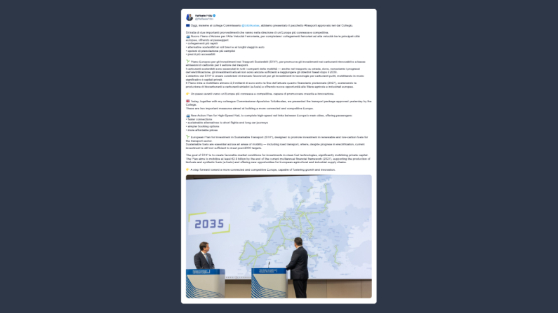Il vicepresidente della Commissione europea, Raffaele Fitto, ha scritto su X: «oggi, insieme al collega commissario Apostolos Tzitzikostas, abbiamo presentato il pacchetto trasporti approvato ieri dal Collegio. Si tratta di due importanti provvedimenti che vanno nella direzione di un’Europa più connessa e competitiva. Nuovo piano d’azione per l’alta velocità ferroviaria, per completare i collegamenti ferroviari ad alta velocità tra le principali città europee, offrendo ai passeggeri: collegamenti più rapidi; alternative sostenibili ai voli brevi e ai lunghi viaggi in auto; opzioni di prenotazione più semplici; prezzi più accessibili. Piano europeo per gli Investimenti nei trasporti sostenibili (Stip), per promuove gli investimenti nei carburanti rinnovabili e a basse emissioni di carbonio per il settore dei trasporti. I carburanti sostenibili sono essenziali in tutti i comparti della mobilità, anche nel trasporto su strada, dove, nonostante i progressi dell’elettrificazione, gli investimenti attuali non sono ancora sufficienti a raggiungere gli obiettivi fissati dopo il 2030. L’obiettivo del Stip è creare condizioni di mercato favorevoli per gli investimenti in tecnologie per carburanti puliti, mobilitando in modo significativo i capitali privati. Il piano mira a mobilitare almeno 2 miliardi e 900 mila euro entro la fine dell’attuale quadro finanziario pluriennale (2027), sostenendo la produzione di biocarburanti e carburanti sintetici (e-fuels) e offrendo nuove opportunità alle filiere agricole e industriali europee. Un passo avanti verso un’Europa più connessa e competitiva, capace di promuovere crescita e innovazione».