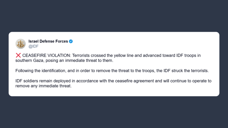Le Forze di Difesa israeliane hanno scritto su X: «violazione del cessate il fuoco, i terroristi hanno oltrepassato la linea gialla e avanzato verso le truppe delle Forze di Difesa israeliane nel sud di Gaza, costituendo una minaccia immediata. Dopo l’identificazione per neutralizzare il pericolo, le Forze di Difesa hanno colpito i terroristi. I soldati rimangono schierati nel rispetto dell’accordo del cessate il fuoco e continueranno a operare per eliminare ogni minaccia immediata».