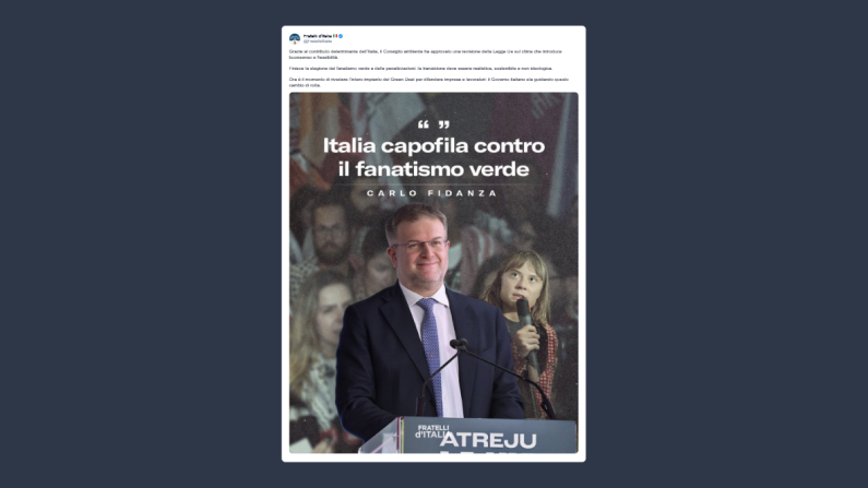 Il partito italiano di maggioranza Fratelli d’Italia ha scritto su X: «grazie al contributo determinante dell’Italia, il Consiglio ambiente ha approvato una revisione della Legge Ue sul clima che introduce buonsenso e flessibilità. Finisce la stagione del fanatismo verde e delle penalizzazioni, la transizione deve essere realistica, sostenibile e non ideologica. Ora è il momento di rivedere l’intero impianto del Green Deal per difendere imprese e lavoratori. Il Governo italiano sta guidando questo cambio di rotta».
