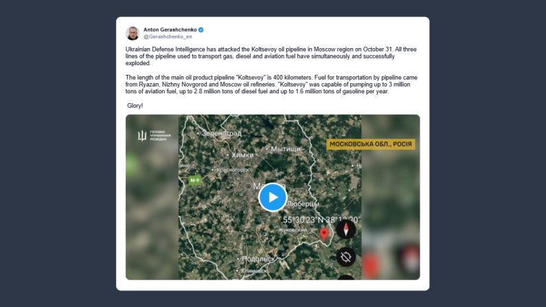 Anton Gerashchenko, ex vice ministro degli Interni ucraino e consigliere ufficiale, ha scritto su X: «l’intelligence della Difesa ucraina ha colpito il 31 ottobre il gasdotto Koltsevoy nella regione di Mosca. Tutte e tre le linee del condotto utilizzate per trasportare gas, diesel e carburante per aviazione, sono state fatte esplose contemporaneamente e con successo. Il gasdotto principale Koltsevoy si estende per 400 chilometri. Il carburante proveniva dalle raffinerie di Ryazan, Nizhny Novgorod e Mosca. Koltsevoy era in grado di pompare fino a 3 milioni di tonnellate di carburante avio, fino a 2 milioni e 800 mila tonnellate di diesel e fino a 1 milione e 600 mila tonnellate di benzina all’anno. Gloria».