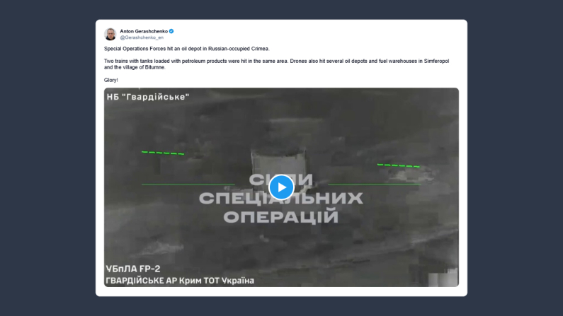 Anton Gerashchenkoex vice ministro degli Interni ucraino e consigliere ufficiale, ha scritto su X: «Le Forze per le operazioni speciali hanno colpito un deposito petrolifero in Crimea, territorio occupato dalla Russia. Nella stessa zona sono stati centrati due convogli ferroviari carichi di cisterne di prodotti petroliferi. I droni hanno inoltre colpito diversi depositi di carburante e magazzini a Simferopoli e nel villaggio di Bitumne».