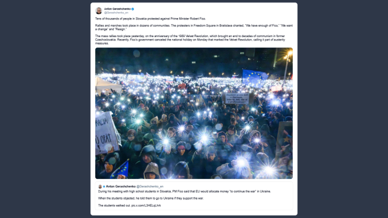Anton Gerashchenko, ex vice ministro degli Interni ucraino e consigliere ufficiale, ha scritto su X: «decine di migliaia di persone hanno manifestato ieri in Slovacchia contro il primo ministro Robert Fico. Cortei e raduni si sono svolti in decine di paesi e città. In piazza della Libertà a Bratislava i manifestanti hanno scandito: ne abbiamo abbastanza di Fico, vogliamo il cambiamento dimettiti. Le grandi proteste sono coincise con l’anniversario della Rivoluzione di velluto del 1989, che pose fine a decenni di comunismo nell’allora Cecoslovacchia. Proprio di recente il Governo Fico ha cancellato la festività nazionale che lunedì commemorava quella rivoluzione, motivando la scelta con le misure di austerità».