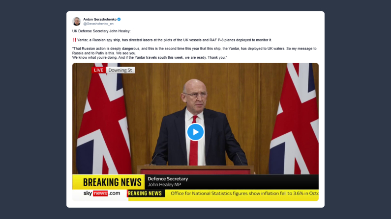 Anton Gerashchenko, ex vice ministro degli Interni ucraino e consigliere ufficiale, ha commentato su X la seguente dichiarazione del ministro della Difesa britannico John Healey: «la nave spia russa Yantar ha puntato laser contro i piloti delle unità navali britanniche e degli aerei RAF P-8 incaricati di sorvegliarla».