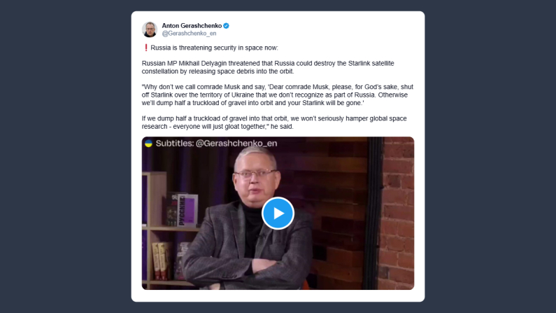 Il deputato russo Mikhail Delyagin ha dichiarato che: «la Russia potrebbe distruggere la costellazione di satelliti Starlink rilasciando detriti spaziali in orbita. Perché non chiamiamo il compagno Musk e gli diciamo: caro compagno Musk, per amor di Dio, disattivi Starlink sul territorio dell’Ucraina che non riconosciamo come parte della Russia. Altrimenti scaricheremo mezzo camion di ghiaia in orbita e i vostri Starlink spariranno. Se scarichiamo mezzo camion di ghiaia in quell’orbita, Non danneggeremo seriamente la ricerca spaziale globale, al massimo tutti gli altri si godranno lo spettacolo».