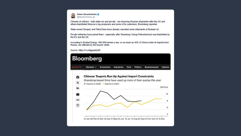 Anton Gerashchenko, ex vice ministro degli Interni ucraino e consigliere ufficiale, ha scritto su X: «le raffinerie petrolifere cinesi, sia quelle statali che quelle private, stanno evitando le forniture russe dopo che Stati Uniti e altri Paesi hanno inserito nella lista nera i principali produttori di Mosca e alcuni dei loro clienti – ha riferito Bloomberg -».