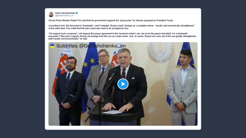 Anton Gerashchenkoex vice ministro degli Interni ucraino e consigliere ufficiale, ha scritto su X: «il primo ministro slovacco Robert Fico ha dichiarato che il suo Governo appoggia il “piano di pace” per l’Ucraina proposto dal presidente Trump. Secondo lui, il documento è “formidabile” e, se adottato, la Russia ne uscirebbe come vincitrice assoluta, rafforzata moralmente ed economicamente. Al tempo stesso, Fico ha osservato che il piano dovrà comunque ricevere l’ok di Kiev. Noi sosteniamo una proposta del genere. La appoggerò al massimo delle mie possibilità, ma riguardo all’accordo di pace in sé si tratta di un documento formidabile. Se questo piano verrà firmato, la Russia uscirà da questa guerra come vincitrice totale. E, certo, ne uscirà notevolmente rafforzata sia sul piano morale sia su quello economico».