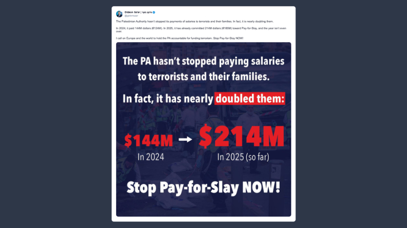 Il ministro degli Esteri israeliano Gideon Sa’ar ha scritto ieri su X: «l’Autorità palestinese non ha interrotto i pagamenti di stipendi ai terroristi e alle loro famiglie. Anzi, li sta quasi raddoppiando. Nel 2024 ha versato 144 milioni di dollari (124 milioni di euro). Nel 2025 ha già stanziato 214 milioni di dollari (185 milioni di euro) per la politica “paga per uccidere”, e l’anno non è ancora finito. Chiedo all’Europa e al mondo di chiamare l’Autorità palestinese a rispondere per il finanziamento del terrorismo».