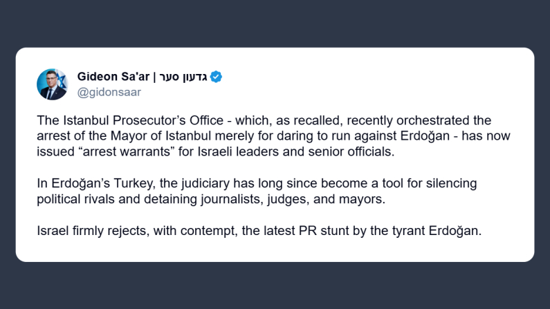 Il ministro degli Esteri israeliano Gideon Sa’ar ha scritto ieri su X: «la procura di Istanbul, quella che di recente ha orchestrato l’arresto del sindaco della città solo per aver osato sfidare Erdoğan, ha emesso mandati di cattura per leader israeliani e alti funzionari. Nella Turchia di Erdoğan la magistratura è da tempo uno strumento per zittire gli avversari politici e incarcerare giornalisti, giudici e sindaci. Israele respinge con sdegno l’ennesima mossa propagandistica del tiranno Erdoğan».