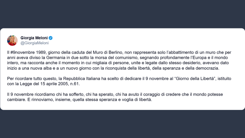 «Il 9 novembre ricordiamo chi ha sofferto, chi ha sperato, chi ha avuto il coraggio di credere che il mondo potesse cambiare. E rinnoviamo, insieme, quella stessa speranza e voglia di libertà».