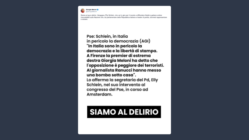 Giorgia Meloni: la Schlein diffonde falsità e getta ombre inaccettabili sulla nazione