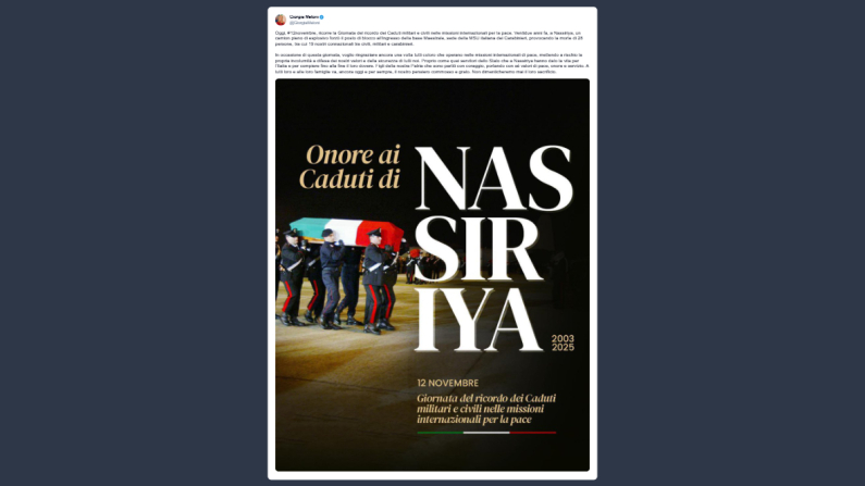 Il presidente del Consiglio, Giorgia Meloni, ha scritto su X: «Oggi, 12 novembre, ricorre la Giornata del ricordo dei Caduti militari e civili nelle missioni internazionali per la pace. Ventidue anni fa, a Nassiriya, un camion pieno di esplosivo forzò il posto di blocco all’ingresso della base Maestrale, sede della MSU italiana dei Carabinieri, provocando la morte di 28 persone, tra cui 19 nostri connazionali tra civili, militari e carabinieri. In occasione di questa giornata, voglio ringraziare ancora una volta tutti coloro che operano nelle missioni internazionali di pace, mettendo a rischio la propria incolumità a difesa dei nostri valori e della sicurezza di tutti noi. Proprio come quei servitori dello Stato che a Nassiriya hanno dato la vita per l’Italia e per compiere fino alla fine il loro dovere. Figli della nostra Patria che sono partiti con coraggio, portando con sé valori di pace, onore e servizio. A tutti loro e alle loro famiglie va, ancora oggi e per sempre, il nostro pensiero commosso e grato. Non dimenticheremo mai il loro sacrificio».
