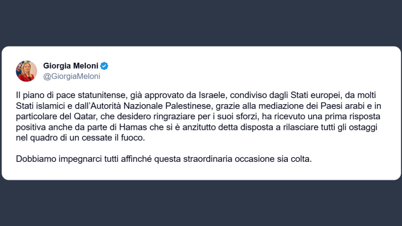 Il presidente del Consiglio, Giorgia Meloni, ha scritto su X: «Il piano di pace statunitense, già approvato da Israele, condiviso dagli Stati europei, da molti Stati islamici e dall’Autorità Nazionale Palestinese, grazie alla mediazione dei Paesi arabi e in particolare del Qatar, che desidero ringraziare per i suoi sforzi, ha ricevuto una prima risposta positiva anche da parte di Hamas che si è anzitutto detta disposta a rilasciare tutti gli ostaggi nel quadro di un cessate il fuoco«.