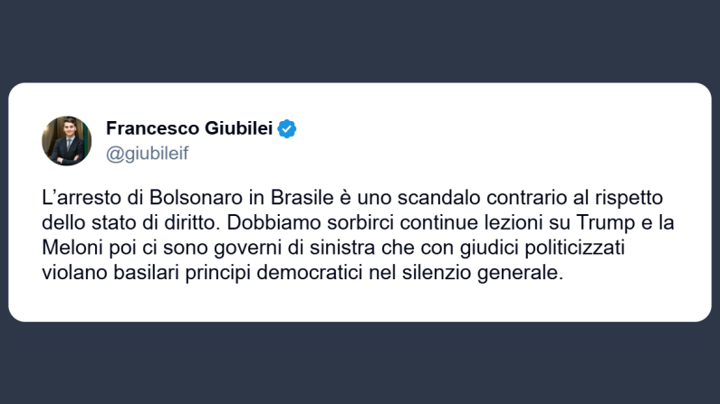 Il direttore scientifico di Fondazione alleanza nazionale, Francesco Giubilei, ha scritto su X: «l’arresto di Bolsonaro in Brasile è uno scandalo contrario al rispetto dello stato di diritto. Dobbiamo sorbirci continue lezioni su Trump e la Meloni poi ci sono governi di sinistra che con giudici politicizzati violano basilari principi democratici nel silenzio generale».
