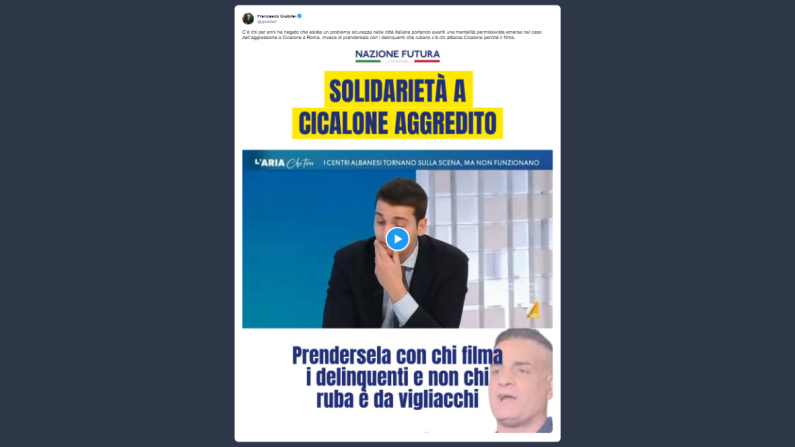 «C’è chi per anni ha negato che esista un problema sicurezza nelle città italiane portando avanti una mentalità permissivista emersa nel caso dell’aggressione a Cicalone a Roma. Invece di prendersela con i delinquenti che rubano c’è chi attacca Cicalone perché li filma».