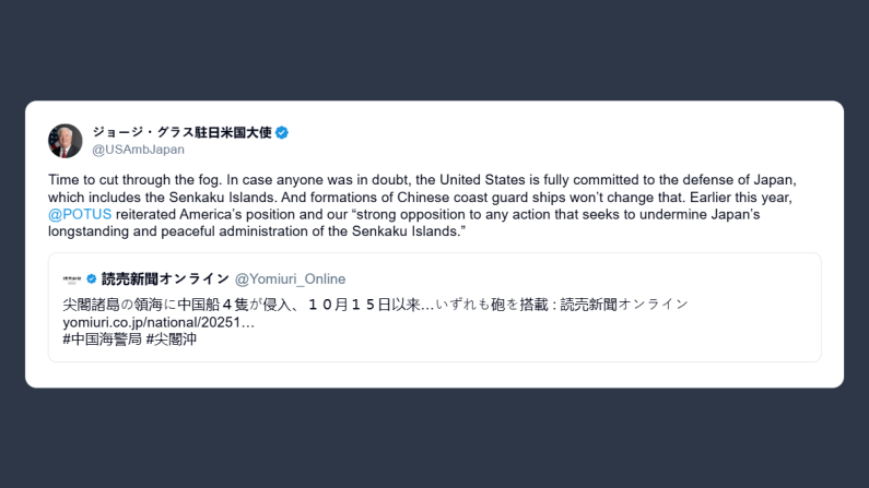 L’ambasciatore degli Stati Uniti in Giappone, George Glass, ha scritto su X: «è ora di dissipare la nebbia. Per chi avesse ancora dubbi, gli Stati Uniti sono pienamente impegnati nella difesa del Giappone, Senkaku incluse. Le formazioni di navi della guardia costiera cinese non cambieranno questa posizione. All’inizio dell’anno, il presidente degli Stati Uniti ha ribadito la linea americana e la ferma opposizione a ogni azione volta a minare l’amministrazione giapponese, da tempo pacifica, delle isole Senkaku».