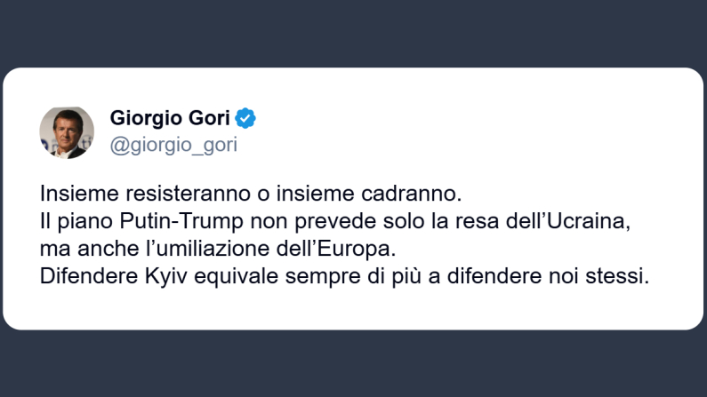 L’europarlamentare del Partito Democratico, Giorgio Gori, ha scritto su X: «insieme resisteranno o insieme cadranno. Il piano Putin-Trump non prevede solo la resa dell’Ucraina, ma anche l’umiliazione dell’Europa. Difendere Kiev equivale sempre di più a difendere noi stessi».