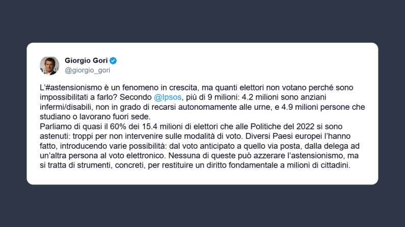 L’europarlamentare del Partito Democratico, Giorgio Gori, ha scritto ieri su X: «l’astensionismo è un fenomeno in crescita, ma quanti elettori non votano perché sono impossibilitati a farlo? Secondo Ipsos, più di 9 milioni; 4 milioni e 200 mila sono anziani infermi disabili che non in grado di recarsi autonomamente alle urne e 4 milioni e 900 mila persone studiano o lavorano fuori sede. Parliamo di quasi il 60% dei 15 milioni 400 mila di elettori che alle Politiche del 2022 si sono astenuti. Troppi per non intervenire sulle modalità di voto. Diversi Paesi europei l’hanno fatto, introducendo varie possibilità, dal voto anticipato a quello via posta, dalla delega ad un’altra persona al voto elettronico. Nessuna di queste può azzerare l’astensionismo, ma si tratta di strumenti, concreti, per restituire un diritto fondamentale a milioni di cittadini».