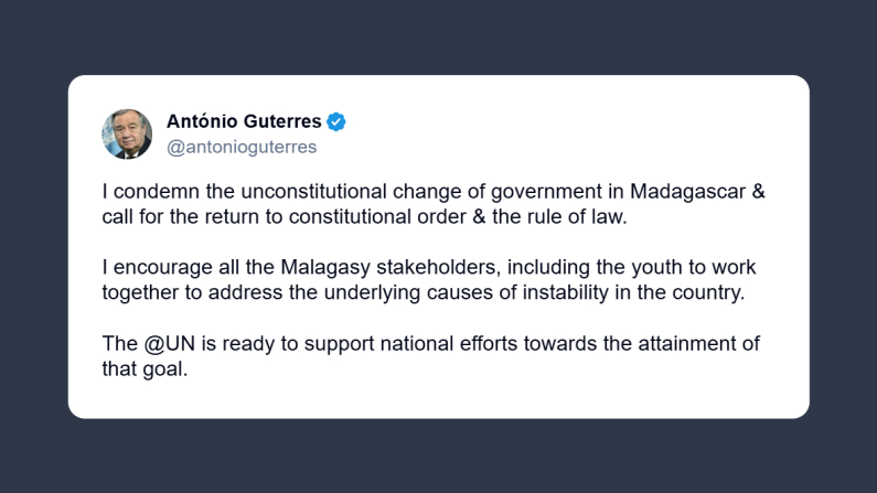 Il Segretario Generale delle Nazioni Unite, António Guterres, ha dichiarato ieri su X: «condanno il cambio di Governo incostituzionale in Madagascar e chiedo il ritorno all’ordine costituzionale e allo Stato di diritto. Esorto tutte le parti interessate malgasce, inclusi i giovani, a collaborare per affrontare le cause profonde dell’instabilità nel Paese». L’Onu, conclude Guterres, è «pronta a sostenere gli sforzi nazionali per raggiungere questo obiettivo».