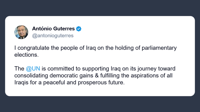 «Congratulazioni al popolo iracheno per lo svolgimento delle elezioni parlamentari. L’Onu si impegna a sostenere l’Iraq nel percorso verso il consolidamento dei progressi democratici e la realizzazione delle aspirazioni di tutti gli iracheni per un futuro pacifico e prospero».