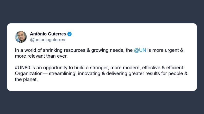 «In un mondo con risorse sempre più scarse e bisogni crescenti, le Nazioni Unite sono più urgenti e rilevanti che mai». Lo ha dichiarato il segretario generale delle Nazioni Unite, António Guterres. «L’anniversario UN80 rappresenta un’opportunità per costruire un’Organizzazione più forte, moderna, efficace ed efficiente, semplificando processi, innovando e ottenendo maggiori risultati per le persone e il pianeta».