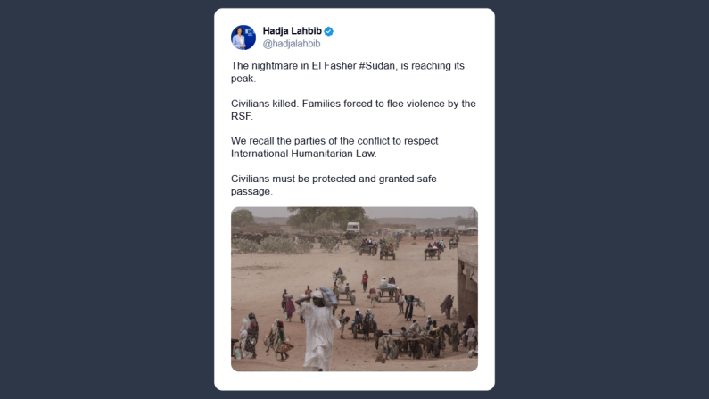 «L’incubo a El Fasher, in Sudan, raggiunge l’apice. Civili uccisi. Famiglie costrette a fuggire dalla violenza delle Forze di supporto rapido. Si richiamano le parti del conflitto al rispetto del diritto umanitario internazionale. I civili devono essere protetti e avere vie di fuga sicure».