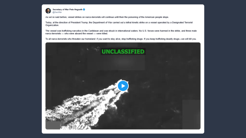 Il ministro della guerra statunitense, Pete Hegseth, ha scritto su X: «come già ribadito, gli attacchi contro le imbarcazioni dei narco terroristi continueranno finché non cesserà l’avvelenamento del popolo americano. Oggi, su diretto ordine del presidente Trump, il ministero della Guerra ha condotto un’azione letale contro un natante gestito da un’organizzazione designata come terroristica. L’imbarcazione trafficava stupefacenti nei Caraibi ed è stata colpita in acque internazionali. Nessun militare statunitense è rimasto ferito, mentre i tre narco terroristi a bordo, tutti uomini, sono stati eliminati. A tutti i narco terroristi che minacciano la nostra patria, se volete restare in vita, smettete di trafficare droga. Se continuate a spacciare sostanze mortali, vi uccideremo».