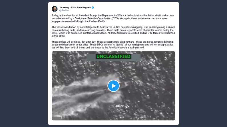 Il ministro della Guerra statunitense, Pete Hegseth, ha scritto su X: «Oggi, su indicazione del presidente Trump, il ministero della Guerra ha condotto un ulteriore attacco contro un’imbarcazione gestita da un’organizzazione terroristica. Ancora una volta, i terroristi erano coinvolti nel traffico di stupefacenti nell’Oceano Pacifico orientale».
