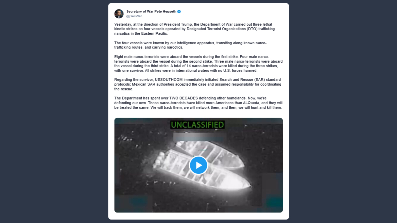 Il ministro della Guerra statunitense, Pete Hegseth, ha scritto su X: «ieri, su direttiva del presidente Trump, il ministero della Guerra ha condotto tre attacchi letali contro quattro imbarcazioni gestite da organizzazioni terroristiche che trafficano stupefacenti nell’Oceano Pacifico orientale. Le quattro imbarcazioni erano note ai nostri servizi di intelligence, navigavano lungo rotte consolidate del narcotraffico e trasportavano droga. Nel primo attacco a bordo c’erano otto uomini narcoterroristi, nel secondo quattro, nel terzo tre. In totale i tre raid hanno eliminato 14 narcoterroristi, con un solo superstite. Tutti gli attacchi sono avvenuti in acque internazionali, senza perdite tra le forze Usa. Quanto al superstite, il comando sud ha immediatamente attivato i protocolli standard di ricerca e soccorso; le autorità messicane hanno preso in carico il caso e coordinano le operazioni. Il ministero difende da oltre vent’anni le patrie altrui. Ora difende la propria. Questi narcoterroristi hanno ucciso più americani di Al-Qaeda e saranno trattati allo stesso modo. Li individueremo e li elimineremo».