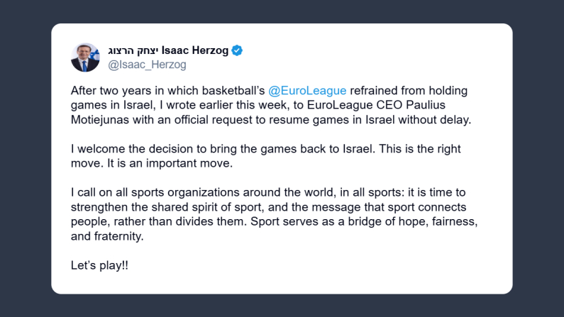 Il presidente israeliano, Isaac Herzog, ha scritto su X: «Dopo due anni in cui la pallacanestro della EuroLeague ha evitato di disputare partite in Israele, all’inizio di questa settimana ho scritto all’Af della EuroLeague Paulius Motiejunas con una richiesta ufficiale di riprendere le partite in Israele senza ulteriori ritardi. Accolgo con favore la decisione di riportare le partite in Israele».